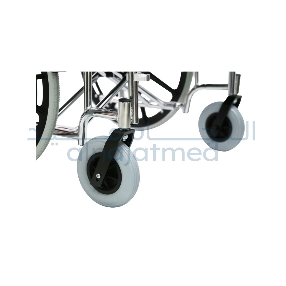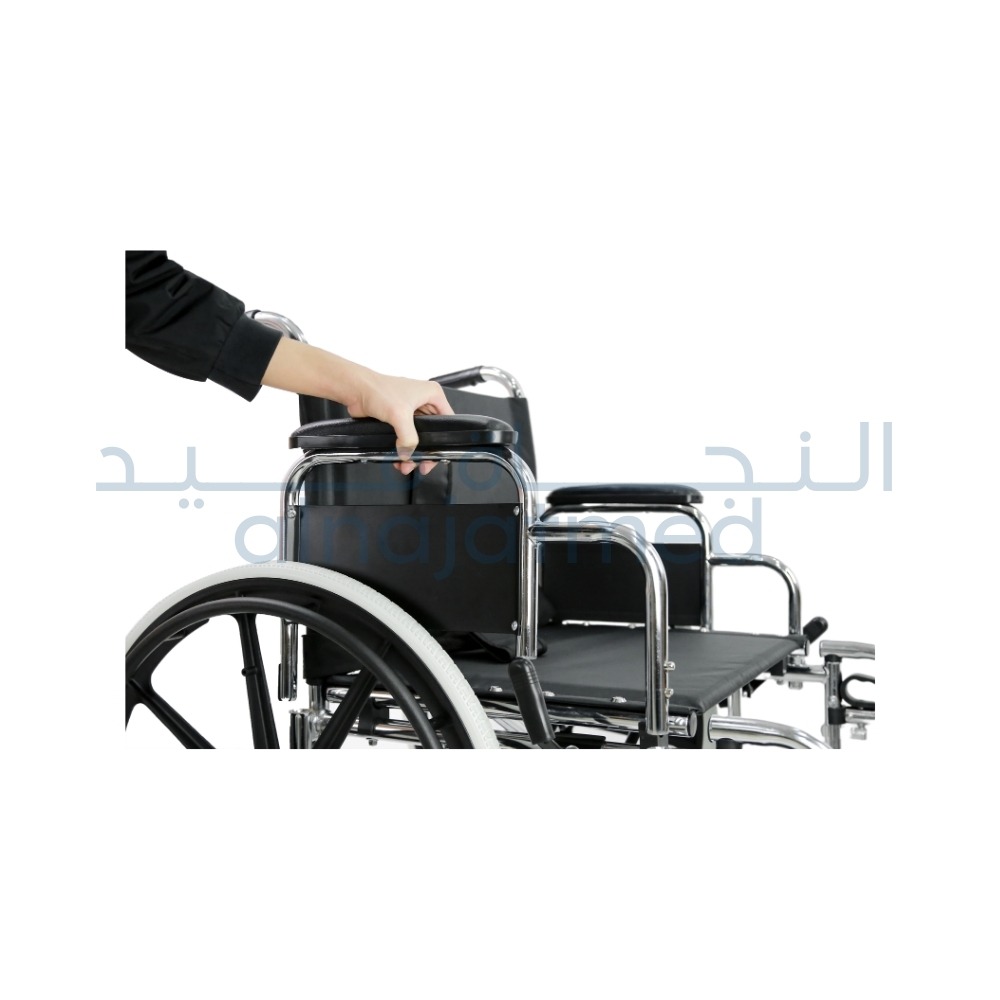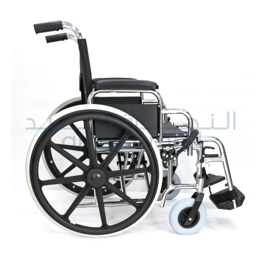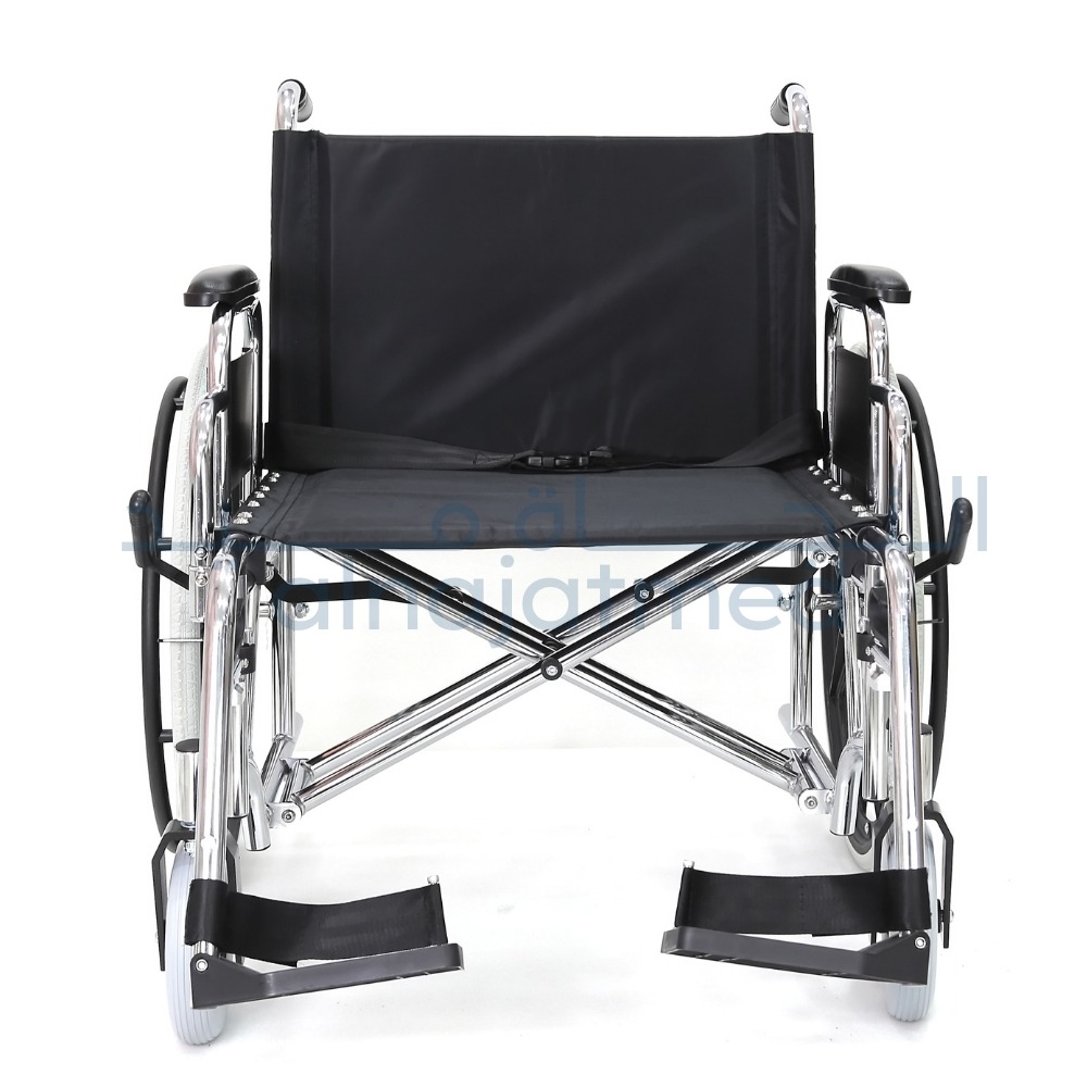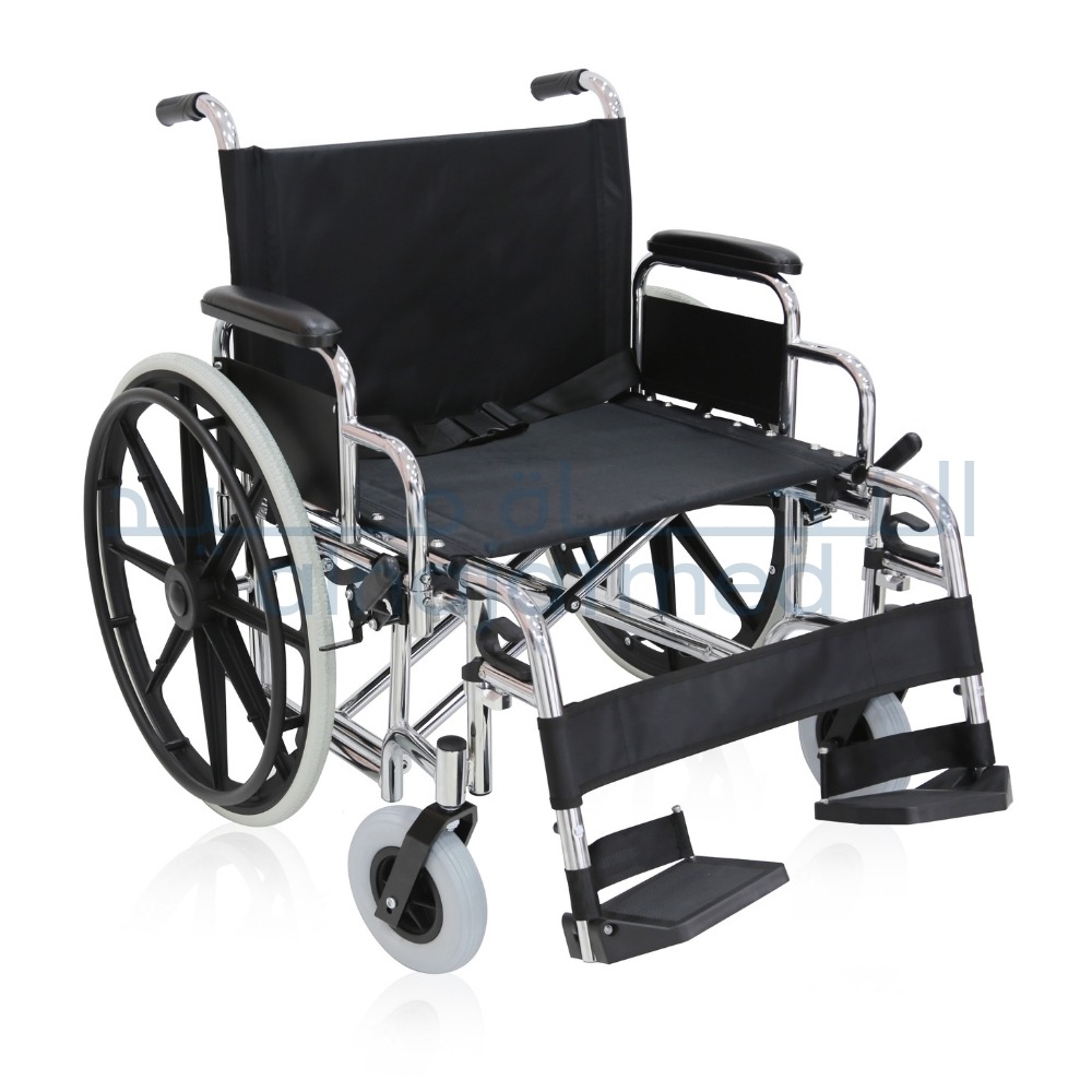 كرسي متحرك متين وموثوق، مصمم لتحمل أوزان عالية. يتميز بإطار فولاذي، ومساند ذراع قابلة للطي، ومساند قدم قابلة للفصل، وعجلات خلفية متينة مقاس 24 بوصة. مصمم للراحة والاستخدام اليومي طويل الأمد.