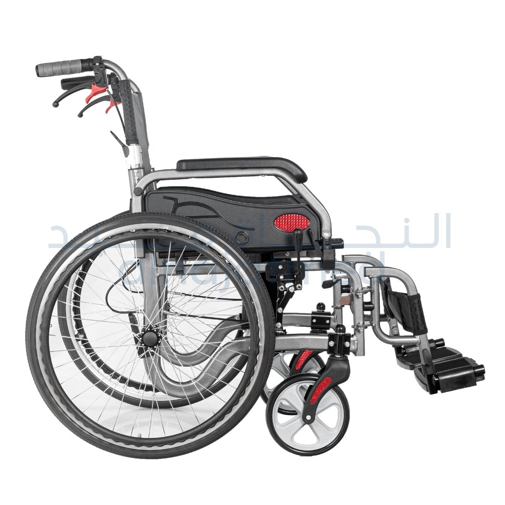 A lightweight and durable aluminum wheelchair designed for everyday comfort and easy transport. Features a liquid-coated frame, flip-up armrests, detachable footrests, and a foldable backrest.